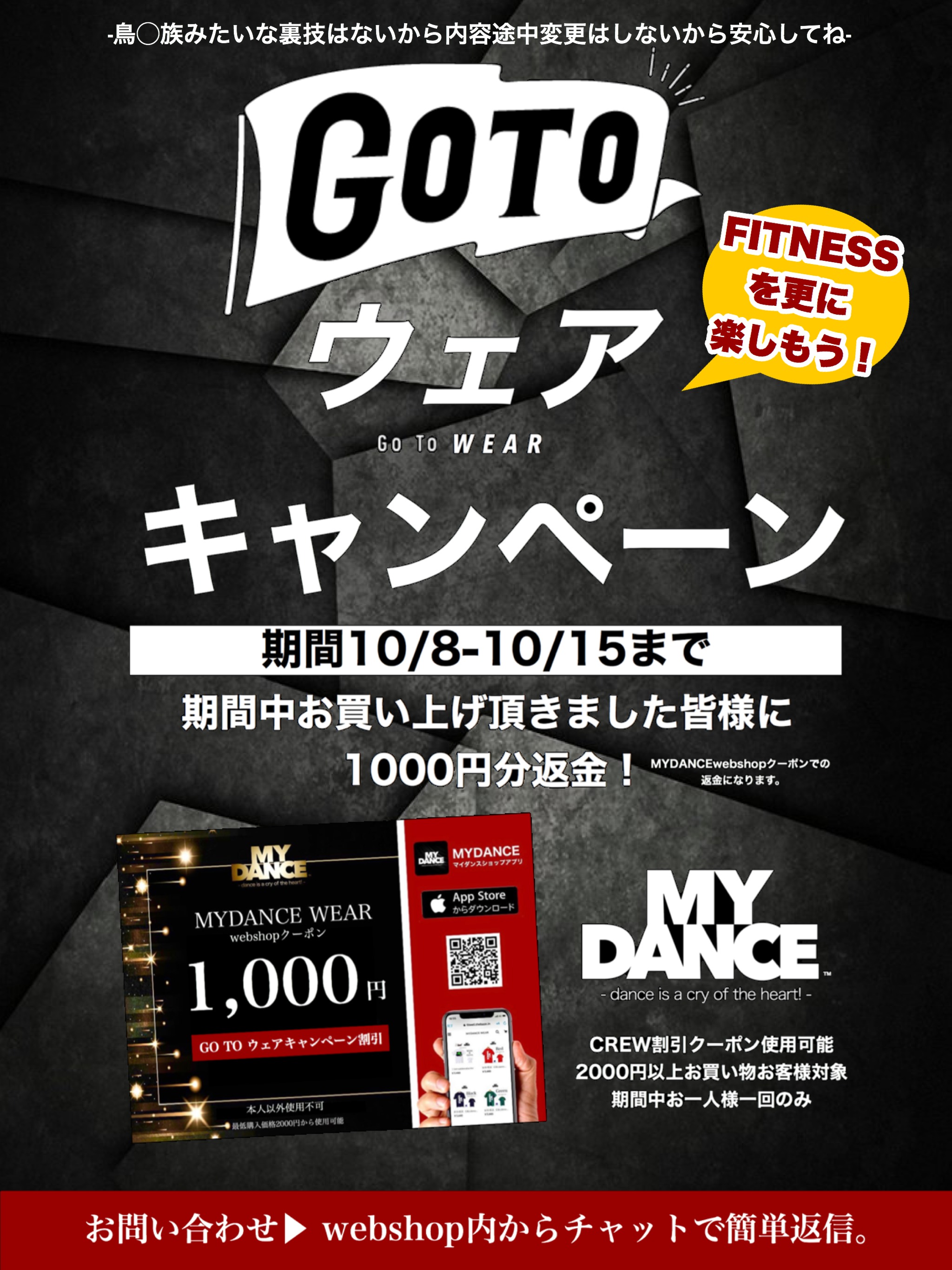 MYDANCE WEAR -GO TOウェアキャンペーン期間中にご購入頂きましたお客様に、webshop内で使用できる1000円分クーポンを返金させて頂きます。